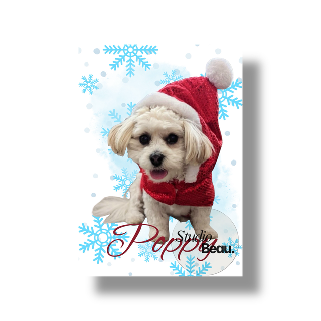 A beautifully personalised print featuring a pet on a Christmas themed background and printed onto a slate.