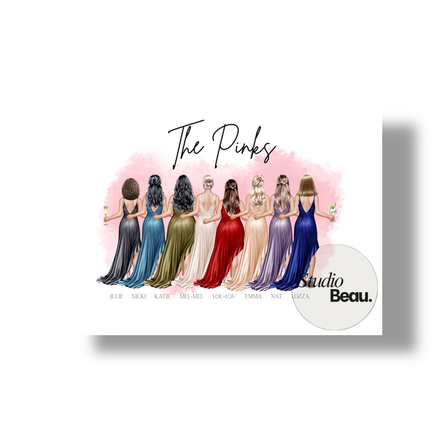 A beautifully illustrated, personalised print featuring a friendship group in a soft watercolour style.